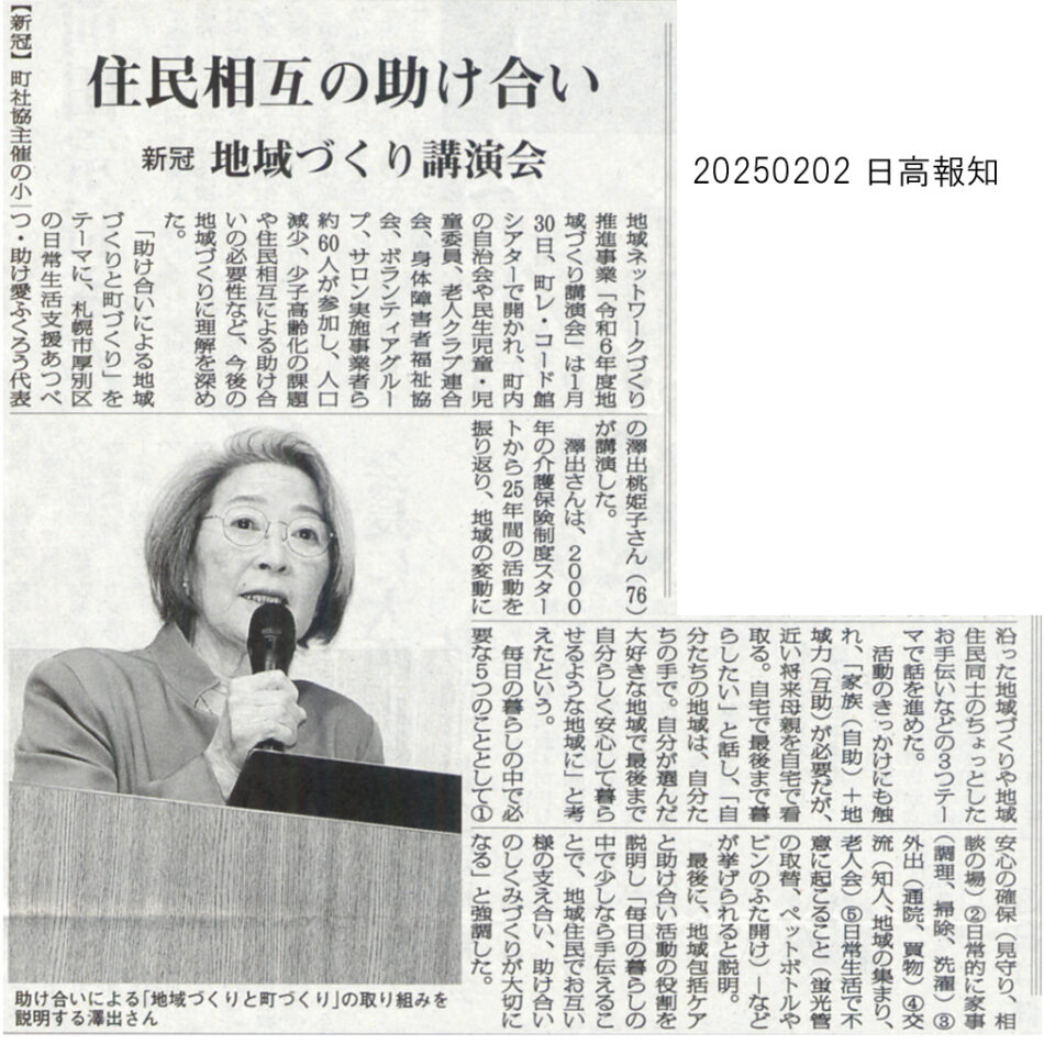 令和7年1月30日(木)に新冠町レ・コード館シアターで行われた地域づくり講演会にて、澤出 桃姫子(NPO法人ホームヘルパーノア理事長、日常生活支援 あつべつ・たすけ愛ふくろう代表)が講演を行いました。